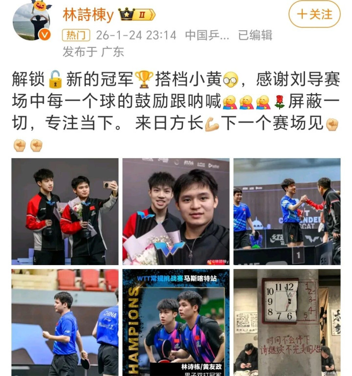 虽然状态低迷,但也算是拿到了2026赛季第一个冠军,所以夺冠之后林诗栋也专门更新了社交媒体,感谢了队友黄友政和场边指导刘志强。